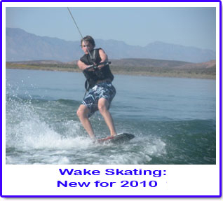 A few weeks ago, Dusty and I were able to go water skiing up on Roosevelt Lake, about 4 hours from Tucson. We went with some friends who had a nice boat, and in addition to several other water toys, they had some wake skates. We both tried it and fell in love with it! A wake skate is shaped similarly to a wake board, but it is smaller, and has no bindings on it…..just a sticky, rubbery surface. Once you’re up on it, there’s all sorts of fun tricks you can do, plus you can just surf up and down on the wake. It was such a blast that we decided it was a must for camp this